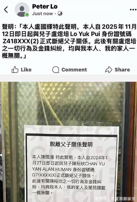 这位香港资深名人、歌手李克勤的岳父,用最决绝的方式宣告与儿子卢煜培切割。更令人揪心的是,声明附上了儿子的身份证号码,在“家丑不可外扬”的传统观念里,这无异于将家庭伤痛赤裸裸地摊在公众视野中。有人唏嘘“亲情终究敌不过钱”,有人好奇“作为女婿的李克勤会如何收场”。