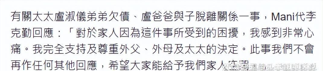 据李克勤的妻子卢淑仪后来回应,弟弟卢煜培的欠款问题已困扰家庭多年,“我们全家已经竭尽全力,多次为他处理债务,几乎倾尽所有,但情况始终没有改善”。这短短一句话,或许是老父亲一次次拿出养老钱填补窟窿,或许是卢淑仪夫妇动用积蓄帮弟弟“擦屁股”。